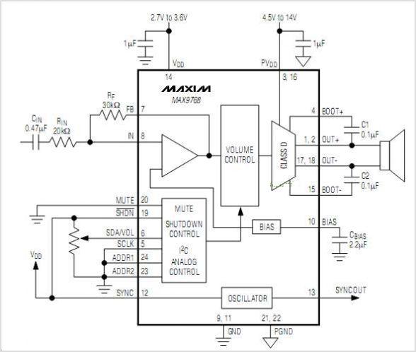 MAX9768具有64級雙模(模擬或數字可編程)音量控制和靜音功能。該音頻放大器工作于4.5V至14V單電源,采用14V電源供電時,可向8Ω揚聲器提供高達10W的輸出功率。