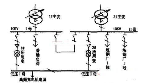 該站充電機電源正常由1#所用主變供電,10kV母聯和低壓母聯均在斷開位置,由于10kV I段母線未帶鋼廠負荷,高頻充電機運行正常。在1#主變更換期間,全站10kV負荷和低壓負荷全部由2#主變所帶,而10kV II母線帶有兩回鋼廠負荷,且該鋼廠未裝消諧裝置,當倒至此方式運行不到10min,該變電站高頻電源模塊就有兩個燒壞,同時也有10kV其他用戶反映其高頻電源燒壞。