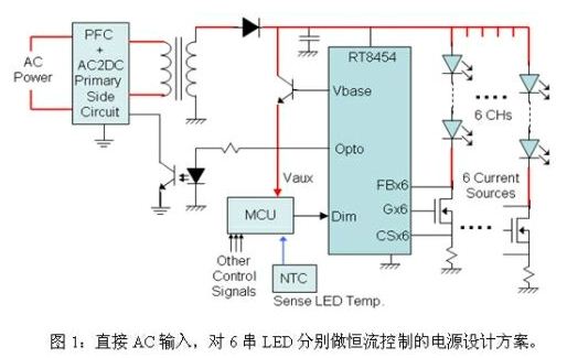 方案一:直接AC輸入,對6串 LED分別做恒流控制
