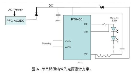 該方案的優點是降壓結構效率較高、單串設計、配置較為靈活,缺點是電路成本較高、LED串聯數目受限于IC耐壓。它適合通過適配器輸入的路燈