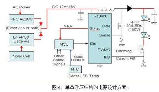 該方案的優點是串聯LED數目不受IC耐壓限制,缺點是電路成本較高,效率較降壓結構稍低。它適合太陽能路燈。