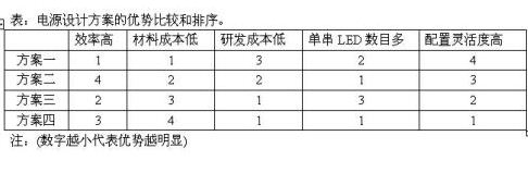 下表對LED路燈四種電源設計方案的優勢進行了比較并排序。