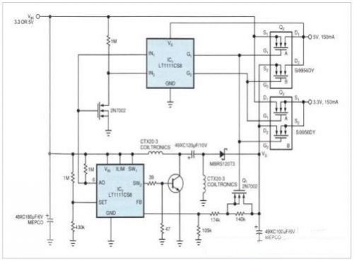 當VIN為3.3V時,IC1使Q1導通,將140kΩ電阻短路,并使DC/DC轉換器部分進入步進升壓模式。在此模式下,轉換器部分在VS上產(chǎn)生5V,通過Q2B提供5V輸出。另外在此模式下,3.3V通過Q3A直接從電路的輸入到輸出。Q2A和Q3B均關斷。