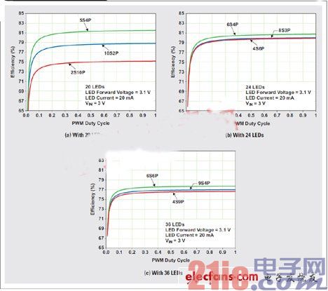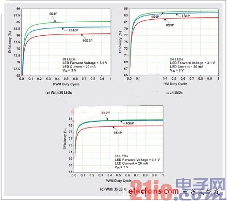 通過選擇串的最佳數目以及每串LED的最佳數目,來最小化功耗和最大化電池使用時間,是一項具有挑戰性的工作。使用更少的串,要求每串有更多的LED,并且會導致升壓轉換器更高的輸出電壓。升壓轉換器輸入和輸出電壓之間的差異越大,其效率也就越低。另外,更多的串會導致更高的總輸出電流,以及更高的電感和升壓整流二極管損耗。圖3顯示了不同串聯(S)和并聯(P)組合時三種不同LED配置的模擬升壓功率級效率。使用更多的串,可讓每串的LED更少,并提供更低的輸出電壓,但它要求更多的電流阱,不得不消耗更多的功率,從而降低驅動器的總效率。