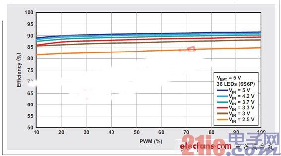 根據前面的分析,具有集成電流阱的背光驅動器,例如:德州儀器TPS61181A筆記本電腦背光驅動器,可以針對平板電腦背光進行優化(參見圖5)。對于那些使用兩節鋰離子電池的平板電腦而言,驅動器和升壓功率級都可以直接通過電池供電。而對于那些只使用單節鋰離子電池的平板電腦來說,驅動器偏壓軌可以由面板的AVDD軌或者系統的另一個電源(4.5V 或者更高)來供電。由于TPS61181A能夠提供比大多數平板電腦要求的功率稍微更高一些的功率(也就是說,功率FET稍微過大,因此RDS(on)非常低),所以相比專為該輸出功率而設計的轉換器,這種轉換器的功耗更低,從而進一步最大化了效率。圖6顯示了6S6P配置TPS61161A的測得效率結果。