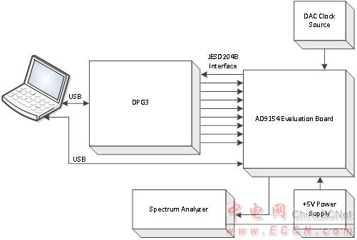 The AD9154-EBZ connects to a DPG3. The AD9154 is a quad JESD204B signal processing RF Digital to Analog Converter. The DPG3 automatically formats the data and sends it to the AD9154-EBZ via its JESD204B lanes. The Evaluation Board (EVB) runs from a single +5V lab supply. A clock distribution chip AD9516 is included on this EVB as a clock fan-out and frequency divider for the DACCLK, JESD204B SYSREF signals, and a CFRAME clock used by the DPG3.Hardware Setup