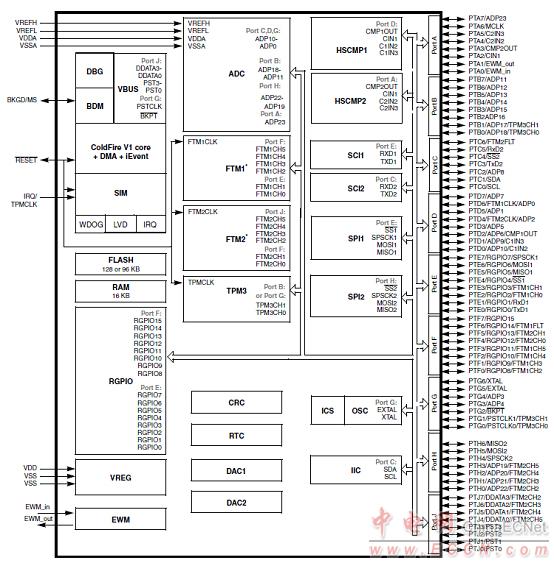 圖1. MCF51AG128系列MCU框圖