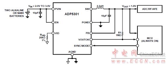 圖2.采用兩節堿性電池/NiMH電池ADP5301應用電路圖