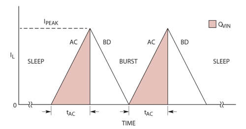 開關(guān) A 和 C 在每個(gè)突發(fā)周期開始時(shí)接通。電感器電流斜坡上升至 Ipeak,然后開關(guān) A 和 C 斷開。接著,開關(guān) B 和 D 接通,直到電感器電流斜坡下降至零為止。這個(gè)周期一直重復(fù),直至 Vout 達(dá)到休眠門限為止。如果 Ipeak 和開關(guān) AC(ON) 時(shí)間 (tAC) 都是已知的,那么 BAT 放電庫(kù)侖量 (圖 3 中的陰影區(qū)域) 可以通過對(duì) AC(ON) 周期計(jì)數(shù)并乘以每個(gè) AC(ON) 期間的電荷量來計(jì)算,每個(gè) AC(ON) 期間的電荷量由以下公式給出: