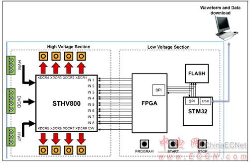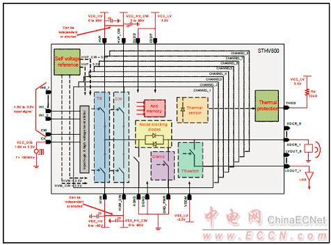 ST公司的STHV800是大容量超聲波發送器,每路有兩個獨立的半橋,輸出電壓0- ±90 V,輸出電流±2 A,由外部時鐘可同步輸入信號,工作頻率高達20MHz,主要用在醫用超聲波圖像,脈沖波形發生器,NDT超聲波發送,壓電變送器驅動等.本文介紹了超聲波系統框圖,STHV800主要特性,內部框圖,評估板STEVAL-IME009V1主要特性,硬件框圖,電路圖和材料清單.