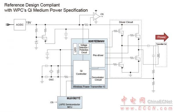 BD57020MWV works as a controller in the wirelesspower transmitter based on the Qi compliant by using itwith a general-purpose microcomputer.