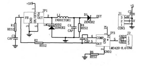 鋰離子電池的充電特性和鎳鎘、鎳氫電池的充電特性有所不同, 鋰離子電池在充電時, 電池電壓緩慢上升, 充電電流逐漸減小, 當電壓達到4.2V 左右時, 電壓基本不變, 充電電流繼續減小。因此對于改型充電器可先用先恒流后恒壓充電方式進行充電, 具體充電電路如圖4 所示。該電路選用LM2575ADJ 組成斬波式開關穩壓器, 最大充電電流為1A.