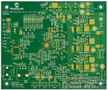 Microchip公司的MCP8025/6是三相無刷DC(BLDC)馬達柵極驅動器,包括有三個能驅動三個外接NMOS/NMOS晶體管對的半橋驅動器,在12V時可提供0.5A的峰值輸出電流.器件集成了比較器,降壓穩壓器,兩個LDO穩壓器,電源監測比較器,超溫傳感器,LIN收發器,零交叉檢測器,中性模擬器和運算放大器.主要用在汽車燃料泵,水泵和通風馬達,家用電器,PMSM控制,業余愛好飛機,船和卡車.本文介紹了MCP8025/6主要特性,框圖和典型應用電路,以及MCP8025 TQFP BLDC馬達驅動評估板主要特性,框圖,電路圖,材料清單和PCB設計圖.