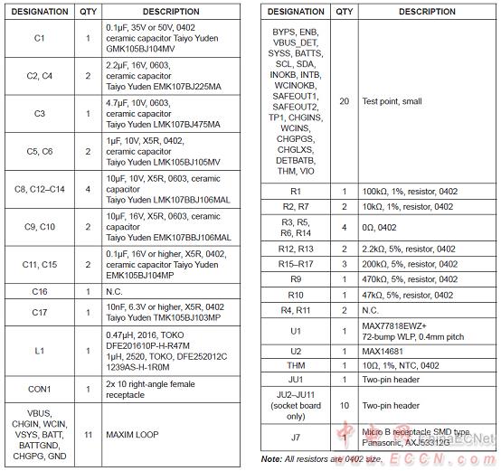 MAX77818評估系統材料清單: