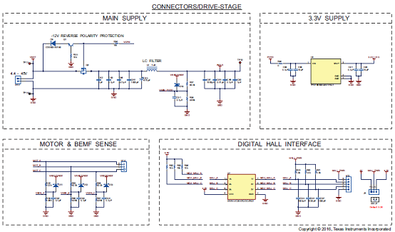 The EVM has onboard reverse battery protection, a regulated 3.3 V supply from the TPS7B6933-Q1 LDO, interface header for all control and feedback signals , and onboard XDS100v2 emulator. The EVM has individual DC bus and phase voltage sense as well as individual low-side current shunt sense for sensorless BLDC control algorithms. The drive stage is fully protected with short circuit, thermal, shoot-through, and undervoltage protection and is easily configurable via an SPI interface.