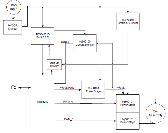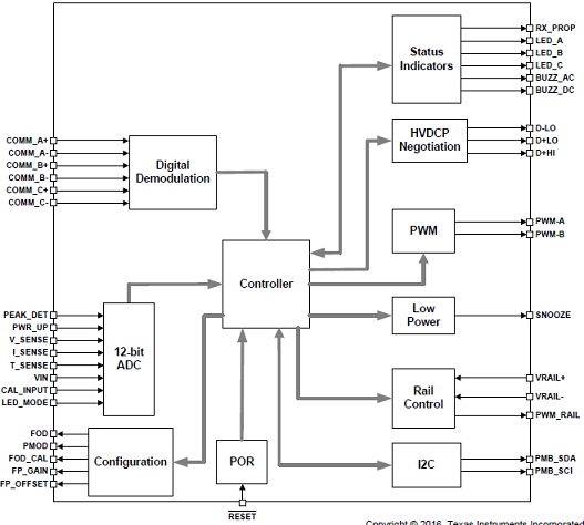 The bq501210 also manages the fault conditions associated with the power transfer and controls the operating mode status indicator. The bq501210 uses a rail voltage control scheme instead of the traditional frequency control to adjust the amount of power delivered to the receiver.