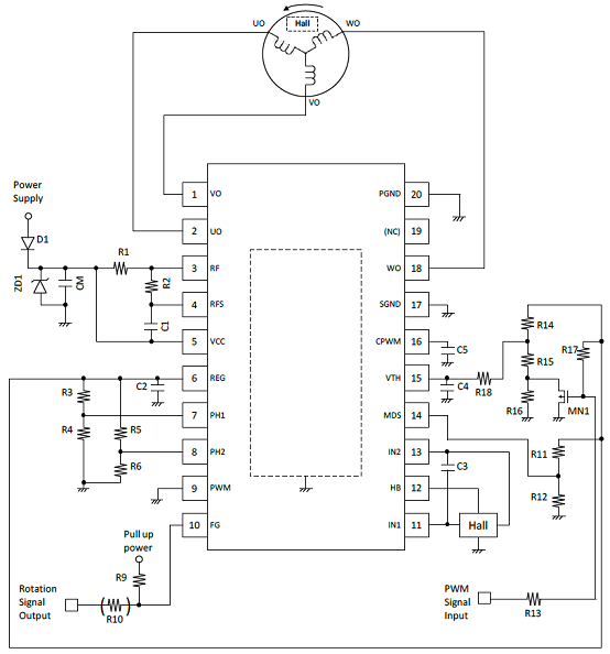 圖2.采用一個霍爾傳感器的LV8811G/13G三相BLDC馬達驅動電路圖(1)