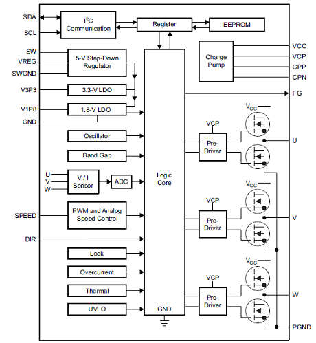 18V、3A三相無刷無感驅動、180˚正弦,集成驅動算法+預驅+MOS |