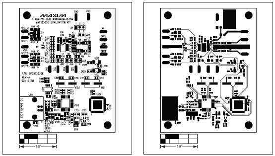 圖7.評(píng)估板MAX13335E EVK PVB設(shè)計(jì)圖(1):左:元件布局;右:元件面走線