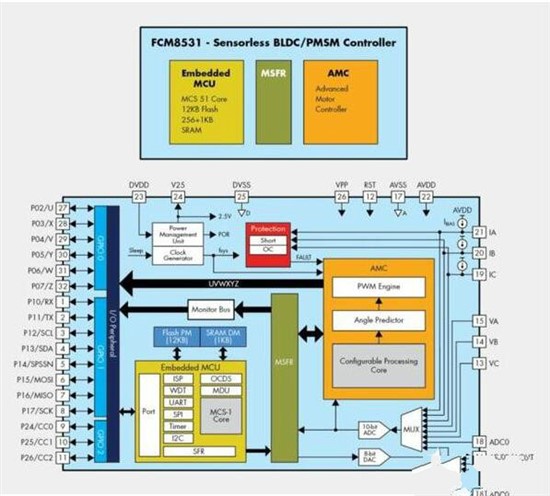 針對采用無傳感器磁場導向控制 (FOC) 的系統,快捷半導體提供了一種配置有并行核心處理器的特定應用控制裝置 FCM8531。 如圖 1 所示,FCM8531 由一個先進馬達控制器 (AMC) 處理器和一個 8 位兼容 80C51 的 MCU 處理器組成。