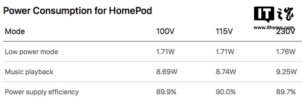 作為一款智能音箱,能源消耗相信并不是用戶在購買時的主要關注點,但蘋果還是向用戶分享了一個典型數據:HomePod在以50%的音量播放音樂時,在115V電壓下的功率是8.74瓦,相較于典型LED燈泡的9~10W的功率來說確實更低,但功率會伴隨音量上升而提高。