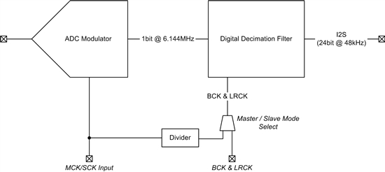 如圖 1 所示,高速主時鐘(例如:24.576 MHz 時鐘)用于驅動 ADC 的過采樣調制器。之后,來自過采樣調制器的數據被消減分解成 LRCK 給定的采樣速率。