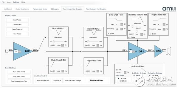 ANC濾波器設(shè)計(jì)工程師的目的是將圖4濾波器仿真線路中的增益和相位響應(yīng)與計(jì)算出的理想曲線匹配起來(lái)。現(xiàn)在人們使用的典型濾波器有一階低通濾波器、陷波濾波器、高架及低架濾波器。設(shè)計(jì)師必須了解不同的拓?fù)浣Y(jié)構(gòu)以及截止頻率、通帶、阻帶的計(jì)算方法。這當(dāng)然不是一個(gè)簡(jiǎn)單的任務(wù),尤其是當(dāng)他們不習(xí)慣使用spice仿真工具和模擬濾波器開(kāi)發(fā)工具時(shí)。