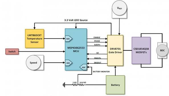 有刷式直流電機參考設計,由DRV8701柵極驅動器、MSP430G2553IPW20超低功耗微控制器、CSD18540Q5B60V N溝道MOSFET和LMT86DCKT精密CMOS溫度傳感器等器件組成。