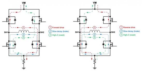 在有刷直流(BDC)電機中,可以使用一個簡單的脈寬調制(PWM)信號來控制該電機轉子的速度。由于PWM信號的占空比改變了傳送的平均電壓到電機是不同的,允許不同的轉子速度,而不會通過一個電阻電位器。然后使用兩相逆變器控制電機的方向這允許使用四個快速改變提供給電機的電流的方向獨立控制的MOSFET。如圖所示。