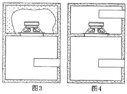 這種音箱比較少見(jiàn),參見(jiàn)圖3、圖4,由圖可以看出,它是在閉箱與倒相式音箱的基礎(chǔ)上發(fā)展而來(lái)的。既有閉箱的設(shè)計(jì)痕跡,也有倒相式音箱的特征,其中圖3所示音箱也有稱(chēng)四階帶通式音箱,圖4所示音箱可以稱(chēng)之為六階帶通式音箱。