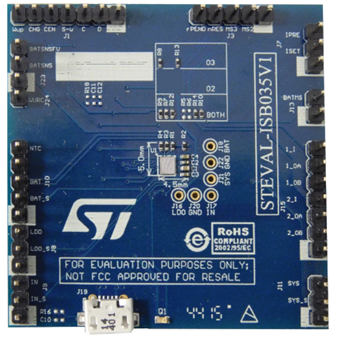 The STEVAL-ISB035V1 is an evaluation board based on the STBC03 battery power management IC, integrating a linearcharger for single-cell Li-Ion batteries with battery protection functions, an LDO regulator and two SPDT load switches.