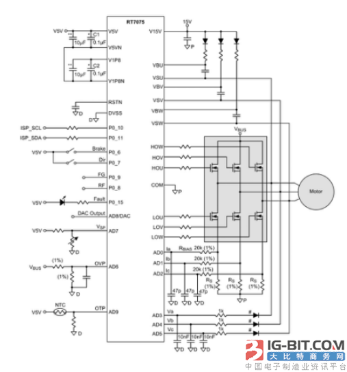 將電機控制器和門極驅動器集成在一起便構成了二合一電機控制 IC RT7075,外加適當規格的 MOSFET/IGBT 和其他輔助電路即可構成滿足特定需求的電機控制電路。由于集成度適中,由其構成的系統元件數量少,具備良好的熱特性,是多品種 PMSM/BLDC 電機驅動應用的理想選擇。 RT7075 采用的電機控制器在設計上與 RT7100 完全相同,因而具有與其完全相同的控制能力和性能指標,控制軟件同樣通過了 UL 安全認證。RT7075 內建的門極驅動器采用浮動通道設計,可支持最高 600V 輸入電壓的應用,所有輸出端都具有 290mA/600mA 的電流吐/納能力,內部設定了死區時間,通道間信號延遲誤差低,具足各種安全保護特性。