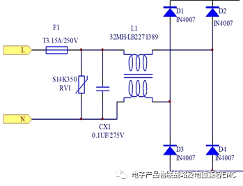 今天內訓我在家用電器產品推薦了EMI濾波器典型參考的關鍵參數設計;在有接地系統的<75W 的FLY的典型濾波器參考如下:(再詳細說明給美的設計師參考)
