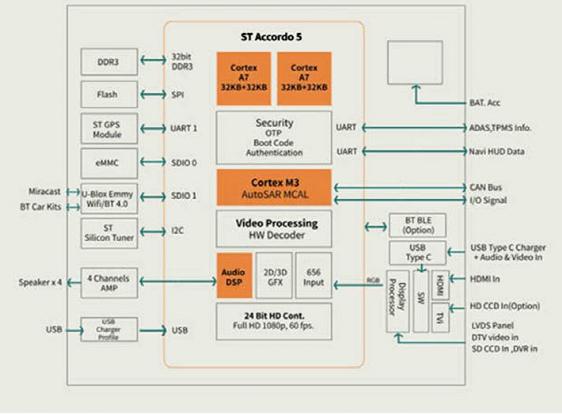 ST的Accordo 5(以下簡稱AC5)汽車處理器可實現駕駛者十分看重的實用功能,例如智能手機投屏可以讓駕駛者在車載顯示屏幕上安全查看或使用手機上的內容,或音樂和導航服務。先進的主處理器和高性能圖形及音視頻引擎可以實現復雜的資訊顯示功能,例如同時顯示使用者界面、倒車影像、導航地圖、視頻預覽。播放功能支持H.264和DivX®等主要視頻編碼格式,以及涉及圖形混合覆蓋等圖效處理的2D和3D圖形。新產品提供USB界面和SD存儲卡界面。