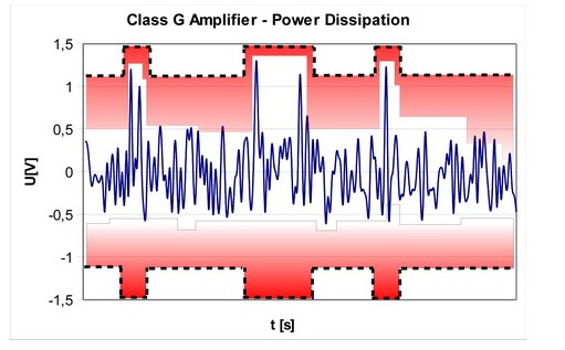 但是,這并不能掩蓋除了在高輸出電壓水平以外,晶體管仍然會消耗大量電能的事實。要解決這個問題,需要改變放大器本身的電源配置,這就是開發G類和H類放大器的原因。