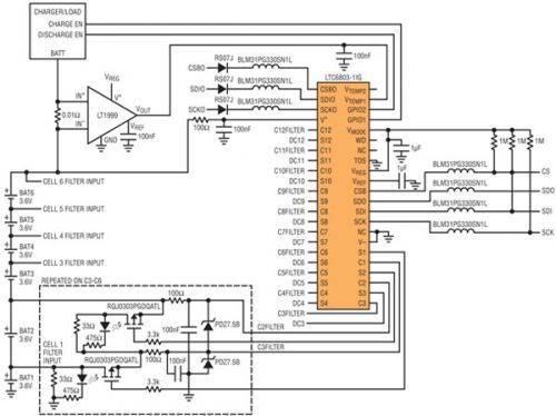 圖 1:6 節(jié)電池監(jiān)視系統(tǒng)的簡化原理圖。LTC6803 測量電池電壓并