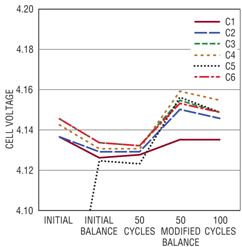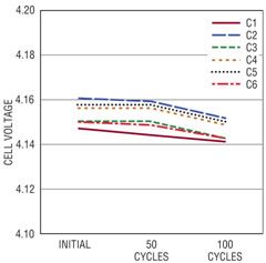 電池組 1 經過了 100 個充電 / 放電周期,圖 3 顯示若干周期后記錄 6 節(jié)電池的電壓。該圖顯示,經過短暫停頓后,在一個完整的充電周期結束時所測得的電池電壓。充電后,電池電壓之間的不平衡與容量和內部電阻的小量變化有關。在第一個完整的周期中,測得的電池組容量為 2.072AHr,經過 100 個周期后,所測得的容量為 2.043AHr,隨著周期數(shù)增加,容量有少量下降。還有一種趨勢,即隨著充電 / 放電周期數(shù)的增加,充電后電池的最終電壓下降了,100 個周期以后,這種趨勢尤其顯著。這種趨勢最有可能是因為電池老化引起電池內部電阻的小量增加導致的。內部電阻增加使電池更快地達到充電結束門限。盡管在工作時沒有平衡,這個電池組在 100 個周期中自始至終保持著同樣程度的不平衡。能像這個電池組一樣,每節(jié)電池自然而然相互匹配的電池組相當罕見。