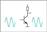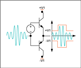 圖2 .B類音頻放大器中,輸出晶體管僅在信號波形的半周期(180°)期間導通。為放大整個信號,使用兩個晶體管,其中一個在正向輸出信號導通,另一個在負向輸出信號導通。