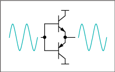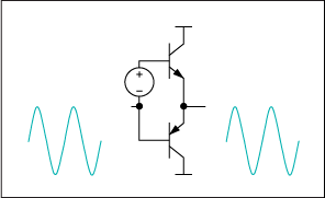 圖3. AB類放大器將兩個晶體管偏置,使其在信號接近零時能夠導通。所以這類放大器的效率比A類放大器高,失真比B類放大器小。