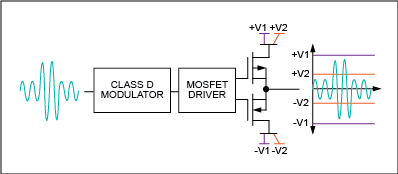 圖6. DG類放大器檢測輸出信號的幅值,然后根據需要切換電源軌,以更高的效率提供需要的功率。