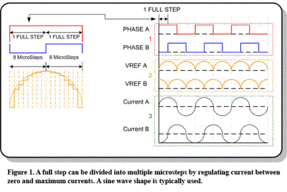 現(xiàn)在,很容易計算出我們馬達的微步進級別。將全步電流強度分成八個更小的電流量級后,馬達繞組受制于八個微步進度。換句話說,我們將1.8度除以8-因此每個微步現(xiàn)在便為0.225度。圖1顯示了通過在零和最大電流設置之間產生多個電流電平(典型正弦波波形后面),將一個全步分成八個微步的過程。