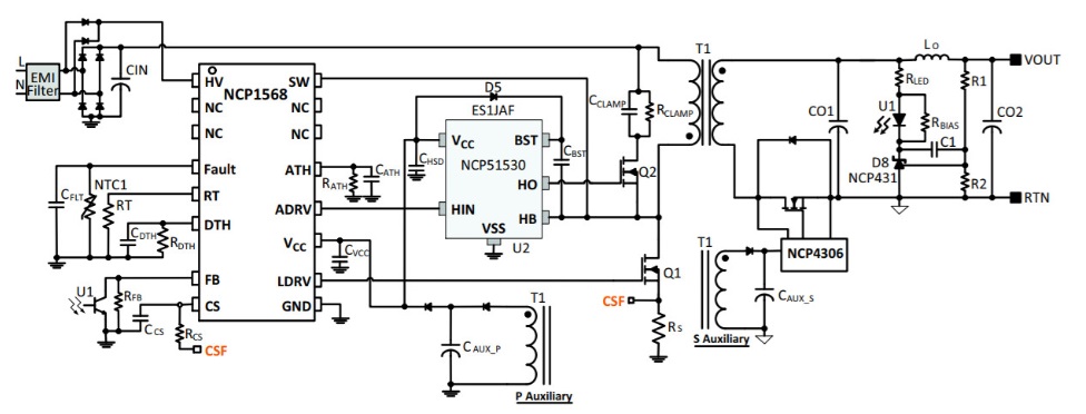 安森美半導體將NCP1568和NCP51530搭配,通過結合一個高能效的拓撲(ACF)和減小器件大小的高頻工作,滿足當前市場的需求。雖然這些優勢是通過可靠的和已證實的硅基超級結FET實現的,但只要成熟,該方案也兼容GaN器件。