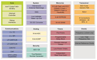 KW36是NXP的一款車規級低功耗藍牙Soc,由ZLG代理銷售。KW36其擁有CAN-FD和LIN外設,適合于各種車載物聯網應用,如圖5 其高配的外設和內存更為KW36添磚加瓦,使其在車載物聯網中如魚得水。