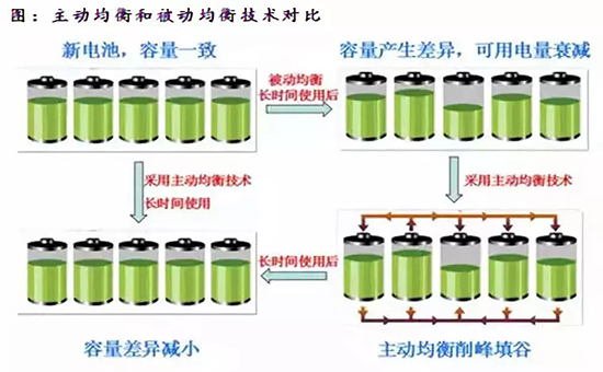 主動均衡充電時將多余電量轉移至高容量電芯,放電時將多余電量轉移至低容量電芯,可提高使用效率,但是成本更高,電路復雜,可靠性低。未來隨著電芯的一致性的提高,對被動均衡的需求可能會降低。