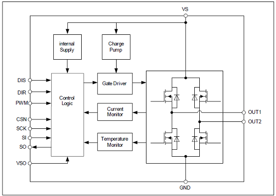 The IFX9201SG is a general purpose 6 A H-Bridge, designed for the control of DC motors or other inductive loads.