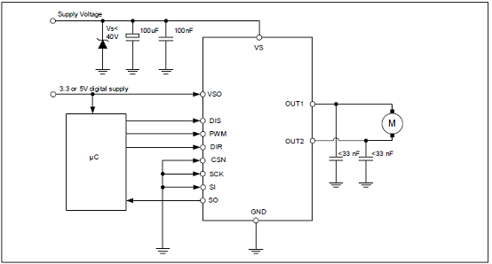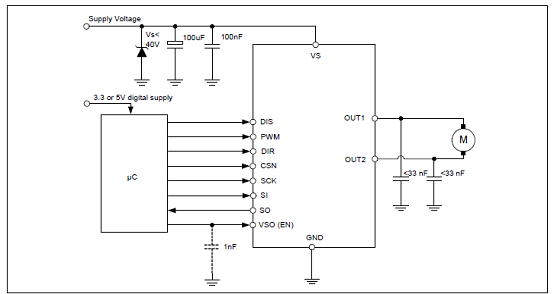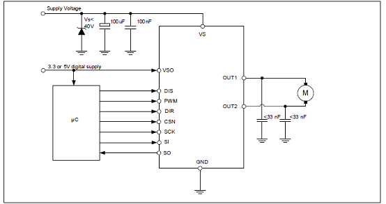 圖2.IFX9201SG帶SPI接口的H橋應用電路圖