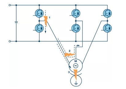 1. 逆變器直通。這可能是由于不正確開啟其中一條逆變器橋臂的兩個IGBT所導致的,而這種情況又可能是因為遭受了電磁干擾或控制器故障。它也可能是因為臂上的其中一個IGBT磨損/故障導致的,而正常的IGBT保持開關動作。
