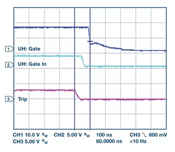 圖6顯示了硬件跳變信號、PWM輸出信號和其中一個逆變器臂的上方IGBT實際柵極-發射極波形之間的延遲。圖中可以看到,IGBT開始關斷后的總延遲約為100 ns。