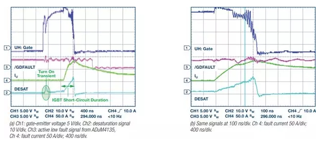 實驗設置采用三相逆變器,該逆變器由交流市電通過半波整流器供電。雖然系統最高可采用800 V的直流總線電壓,但本例中的直流總線電壓為320 V。正常工作時,0.5 HP感應電機由開環V/Hz控制驅動。IGBT采用International Rectifier提供的1200 V、30 AIRG7PH46UDPBF?刂破鞑捎肁DI的ADSP-CM408F Cortex®-M4F混合信號處理器。使用隔離式Σ-Δ AD7403調制器進行相位電流測量,使用ADuM4135實現隔離式柵極驅動(它是一款磁性隔離式柵極驅動器產品,集成去飽和檢測、米勒箝位和其它IGBT保護功能)。在電機相位之間,或在電機相位和負直流總線之間手動開關短路,進行短路測試。 本例中未測試短路至地。
