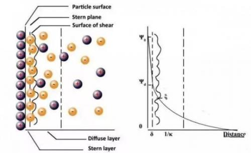 下圖為Stern雙電層模型,zeta電位(ξ,Zeta potential)為雙電層模型中極重要的參數,實際測量時并無法直接測得粒子的表面電位,但可由聲波法或是電泳法計算出粒子的zeta電位。雙電層模型中Stern 層與擴散層間的剪切平面上存在zeta電位。